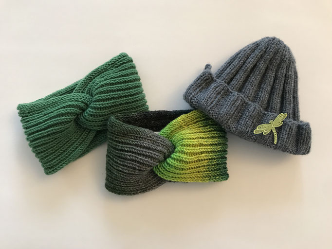 Merino- und Cashmere-Wolle sind meine Lieblingsmaterialien. Stirnbänder für die ganze Familie aus Merino. Cashmere Handwärmer und Mützen. Aus den Resten gab's noch Bébé-Finkchen. Die Mütze im zweifarbigen Patentmuster kostete mich viele Rückwärtsrunden. Dafür sind die Waschlappen pure Erholung.